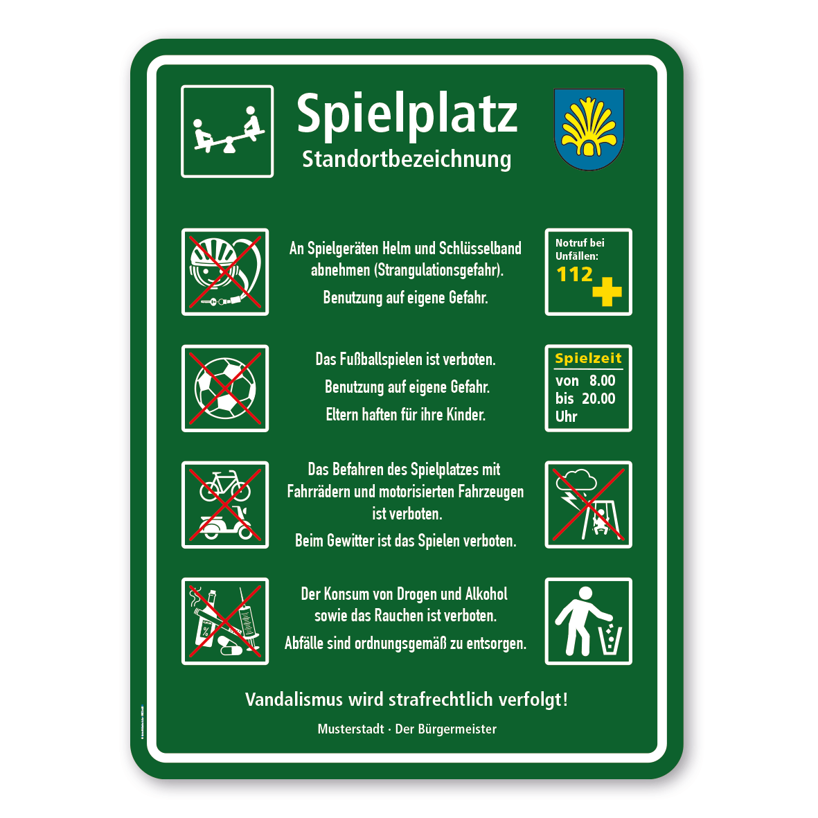 Spielplatzschild - Spielplatz - mit Wippe und großem Gemeindewappen - mit Zusatztexten und 8 frei zu wählenden Piktogrammen – Schilderserie SP-03