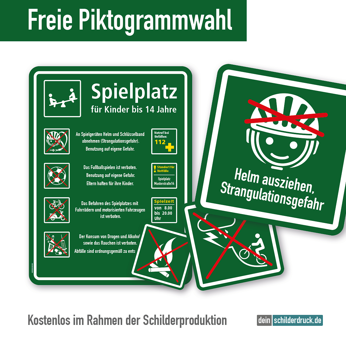 Dieses Spielplatzschild mit frei zu wählenden Piktogrammen ist ein Schild aus unserer Spielplatz-Schilderserie SP-03, deren grüne Themenschilder mit weißen Texten und Grafiken auf das Wesentliche reduziert sind. Trotz ihrer grafischen Einfachheit sind die Themenschilder dieser Spielplatzschilderreihe aussagestark, zugleich aber auch kindgerecht, so dass sie sowohl für Kinderspielplätze als auch für Sportanlagen für Jugendliche und Erwachsene gleichermaßen geeignet sind. Wie alle unsere Spielplatzschilder, überzeugen auch die Schilder der Serie SP-03 mit vielfältigen Individualisierungsmöglichkeiten. So können Sie sich aus zahlreichen Piktogrammen ein auf Ihre Bedüfnisse zugeschnittenes Spielplatzschild zusammenstellen, den Schildertitel und andere Textinformationen kostenlos ändern wie auch alle Textinformationen in den Piktogrammen anpassen lassen. In Verbindung mit unseren sicherheitsrelevanten Piktogrammen und Informationen zur Spielsicherheit sowie Kontaktdaten für den Notfall entsprechen alle Spiel- und Sportschilder der Schilderserie SP-03 der europäischen Norm DIN EN 1176:2008-08.