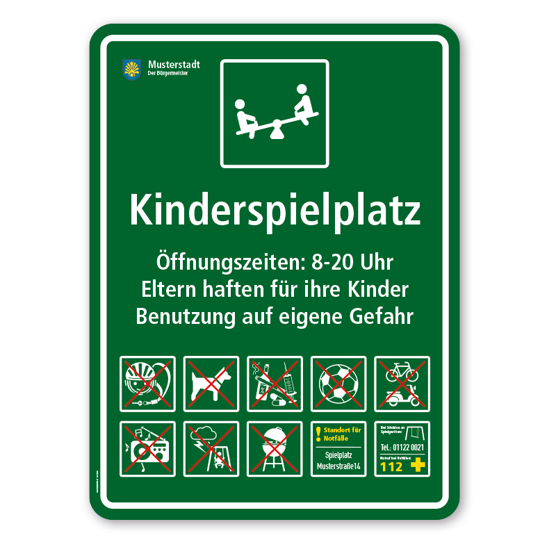 - Bitte beachten Sie, dass konfigurierte Spielplatzschilder und Sportplatzschilder individuelle Artikel sind. Ein Rückgaberecht ist ausdrücklich ausgeschlossen.