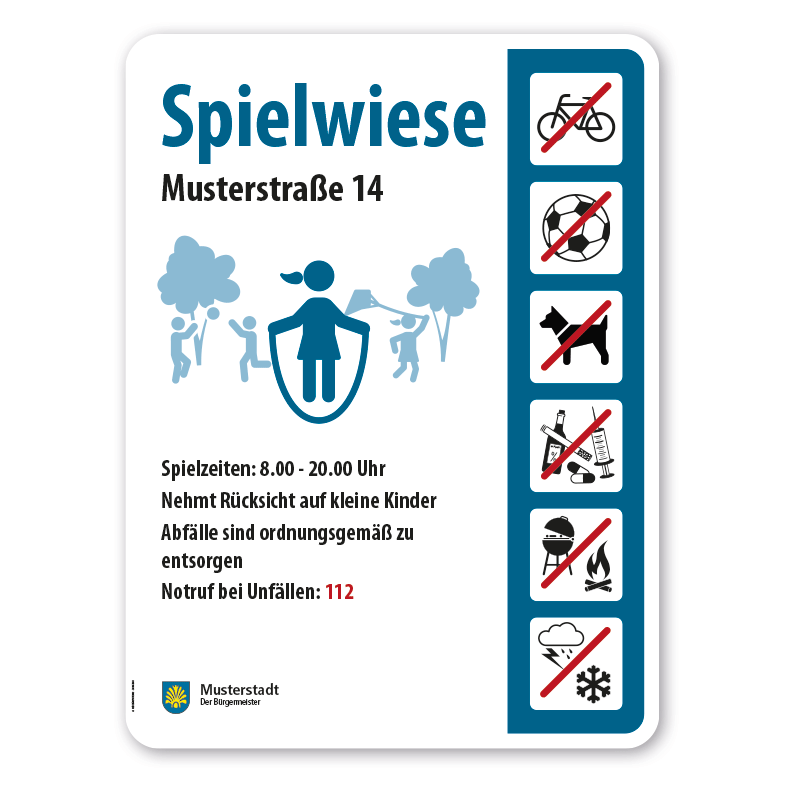 - Bitte beachten Sie, dass konfigurierte Spielplatzschilder und Sportplatzschilder individuelle Artikel sind. Ein Rückgaberecht ist ausdrücklich ausgeschlossen.