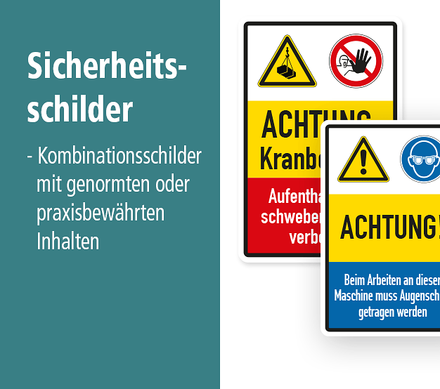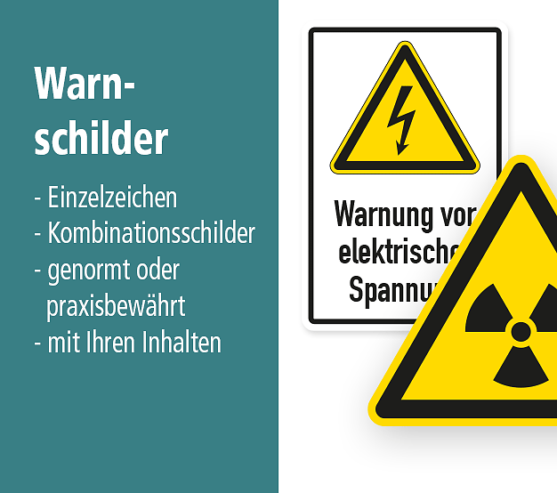 Warnschilder sind in zahlreichen Themen, Größen und Ausführungen erhältlich – als einzelne Warnzeichen mit einer unmissverständlichen Symbolik, aber auch als Kombinationsschilder mit zusätzlichen Sicherheitsinformationen, die die Bedeutung der Warnzeichen unterstreichen oder aufgrund betriebsspezifischer Gegebenheiten erforderlich sind. Warnzeichen sind stets dreieckig mit einem schwarzen Rand und Symbol auf gelbem Grund.