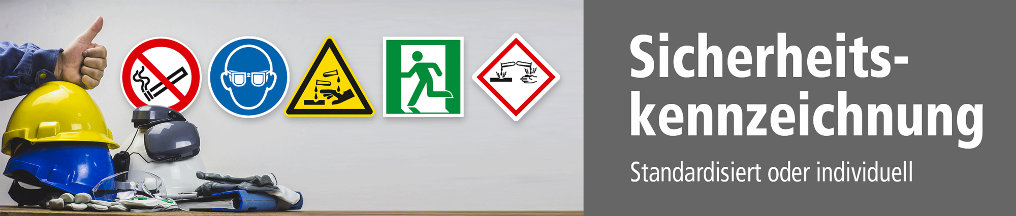 Wir führen geeignete Schilder zur Sicherheitskennzeichnung für Unternehmen, Betriebsgelände, Lager und Büros wie auch für die private Nutzung in vielen Größen und Ausführungen, als Einzelzeichen oder in Kombination mit Textinhalten, um den gängigsten Anforderungen gerecht zu werden, produzieren aber auch bedarfsbezogen und individuell nach Ihren Vorgaben und dem jeweiligen Verwendungszweck entsprechend. Weitere Informationen zur Sicherheitskennzeichnung sowie die Übersichten der verfügbaren Zeichen können Sie über unseren Download-Bereich abrufen (PDF).