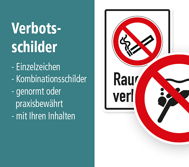 Unsere Verbotsschilder sind in zahlreichen Themen, Größen und Ausführungen erhältlich – als einzelne Verbotszeichen mit einer unmissverständlichen Symbolik, aber auch als Kombinationsschilder mit zusätzlichen Textinhalten, die die Bedeutung der Verbotszeichen mit geeigneten Hinweisen unterstreichen oder aufgrund betrieblicher Sonderheiten erforderlich sind. Verbotszeichen sind stets rund mit einem roten Rand und diagonal verlaufenden Balken, der das jeweilige, zumeist schwarze Symbol überlagert.