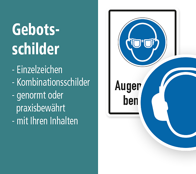Wir führen Gebotsschilder in zahlreichen Themen, Größen und Ausführungen – als einzelne Gebotszeichen mit einer unmissverständlichen Sicherheitssymbolik, aber auch als Kombinationsschilder mit zusätzlichen Textinhalten, die die Bedeutung der Gebotszeichen mit geeigneten Hinweisen unterstreichen oder aufgrund bestimmter, praxisorientierter Gegebenheit erforderlich sind. Gebotszeichen sind stets rund mit weißen Symbolen auf blauem Grund.
