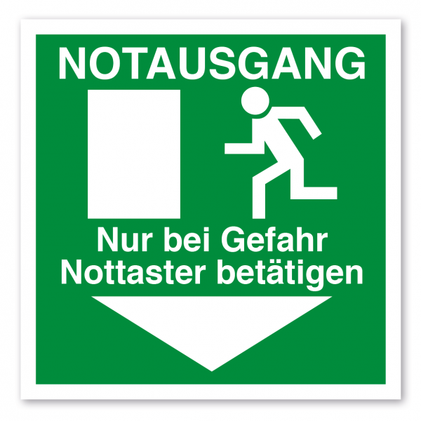 Produktinformationen "Rettungszeichen Notausgang - nur bei Gefahr Nottaster betätigen"