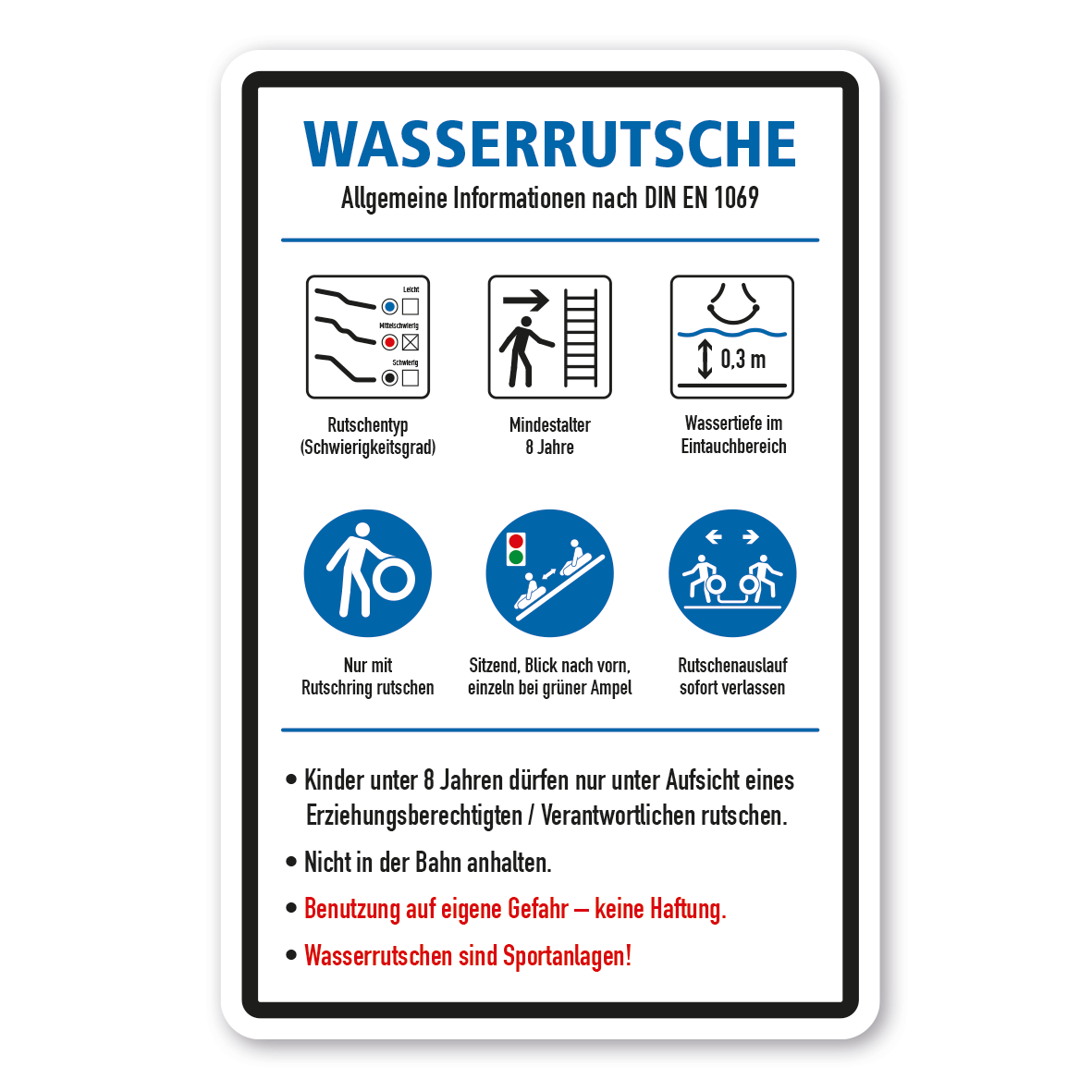 Schild für Wasserrutschen mit Rutschring - Allgemeine Informationen zur Nutzung nach DIN EN 1069-2:2017