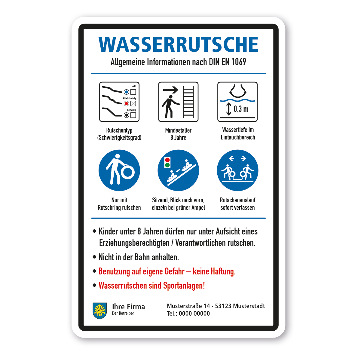 Schild für Wasserrutschen mit Rutschring - Allgemeine Informationen zur Nutzung nach DIN EN 1069-2:2017 – Hinweise und Verhaltensregeln für Wasserrutschen als Kombinationsschild mit individueller Zeichen- und Textwahl. Unsere Kombinationsschilder für Wasserrutschen erfüllen mit der richtigen Wahl der Sicherheitszeichen und den benötigten Zusatzinformationen sowie Betreiberinformationen die Beschilderungsvorgaben nach DIN EN 1069-2:2017. Die vielfälltigen Individualisierungsmöglichkeiten erfüllen zudem auch alle Voraussetzungen für eine flexible, bedarfsbezogene Beschilderung Ihrer Wasserrutsche.