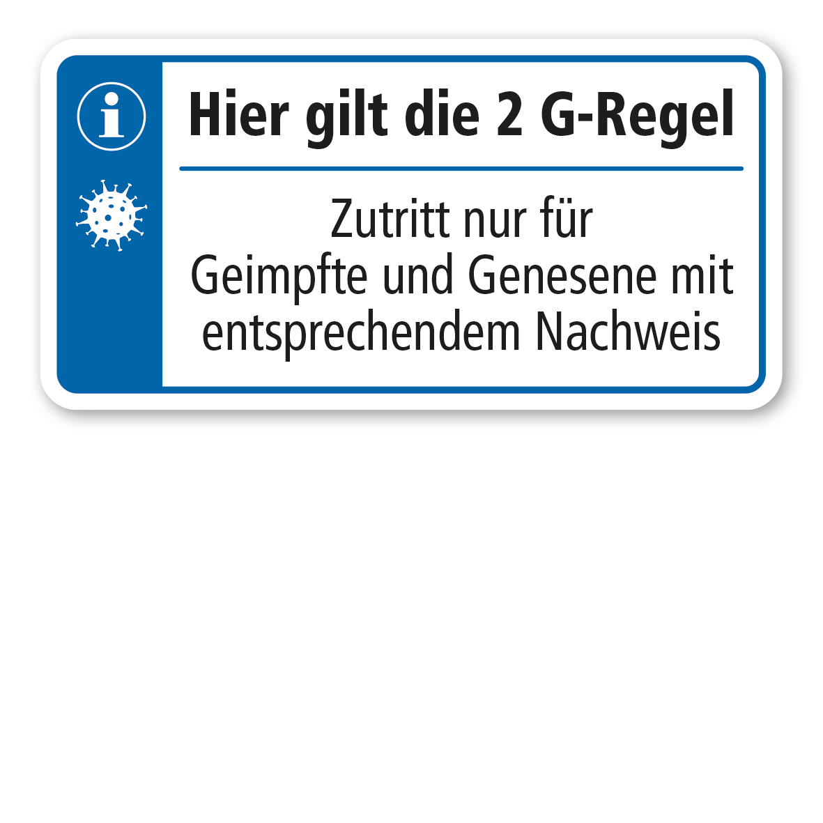 Corona-Gebotsschild Hier gilt die 2 G-Regel - Zutritt nur für Geimpfte und Genesene mit entsprechendem Nachweis. Diese Kennzeichnung ist geeignet für den Einzelhandel, die Gastronomie und Betriebe sowie andere Bereiche. Sie ist in mehreren Größen als Aufkleber oder Schild erhältlich – auch mit Ihrem Wunschtext.