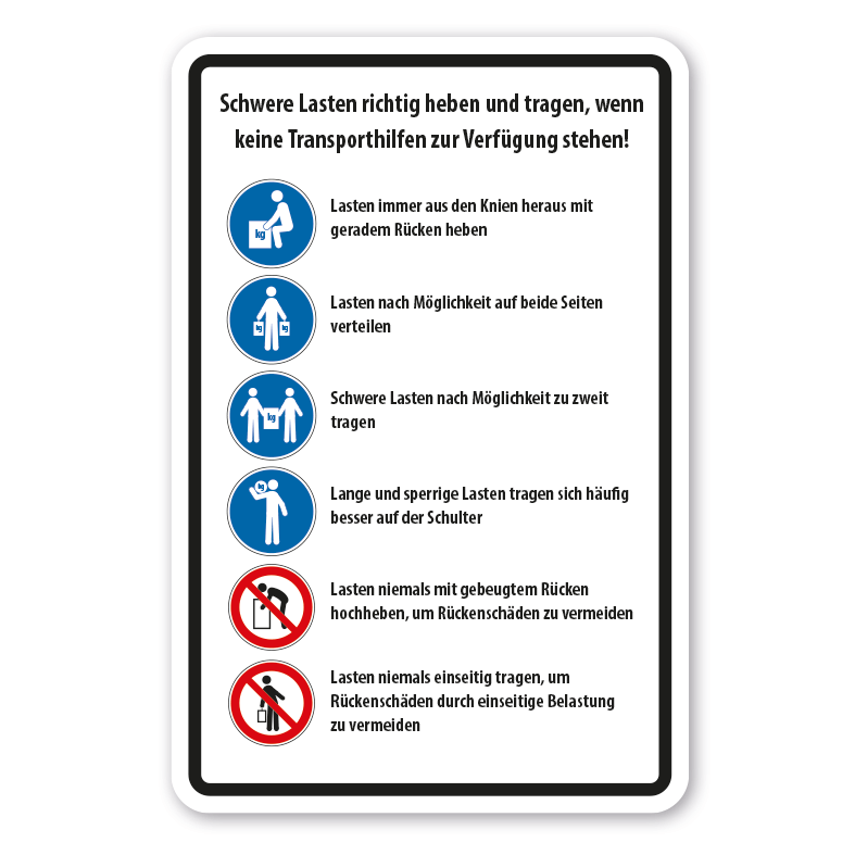 Schild Schwere Lasten richtig heben und tragen, wenn keine Transporthilfen zur Verfügung stehen. In diversen Größen erhältlich, auch mit Ihrem Wunschtext.