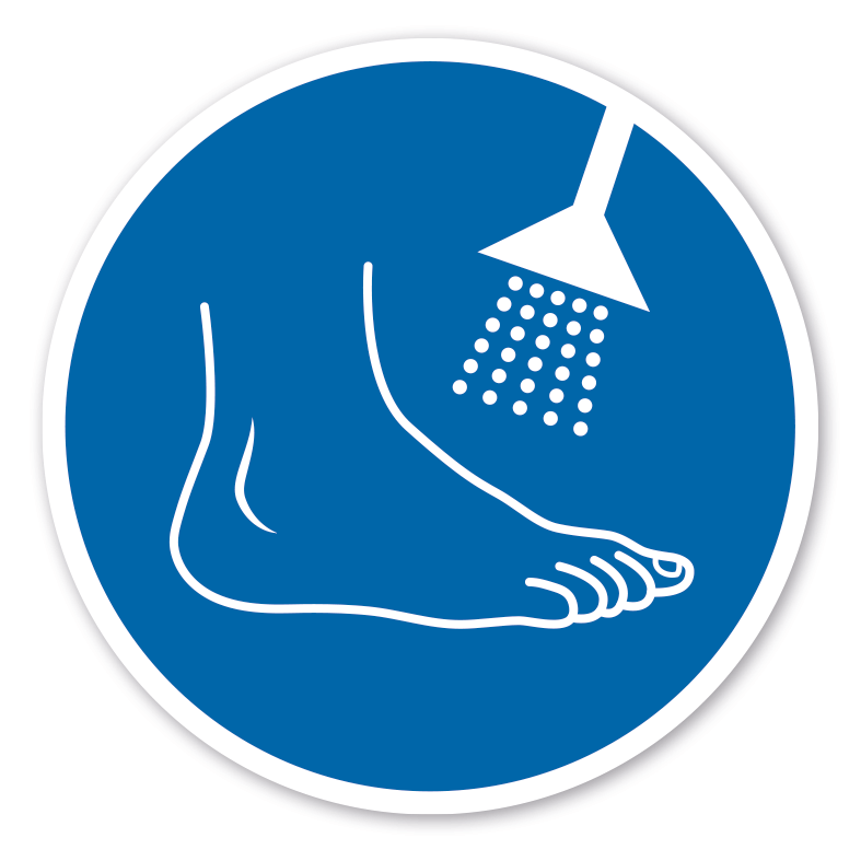 Gebotszeichen Nur mit sauberen Füßen gestattet. Gebotsschild für Wasserutschen und Wasserrutschenbereiche. Um Verletzungen zu vermeiden, ist das Zielgebiet/Rutschenauslauf umgehend zu räumen. Erforderlich, sofern zutreffend, für eine Beschilderung nach DIN EN 1069-2:2017.