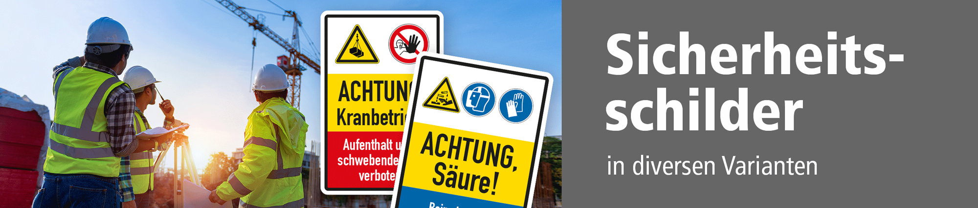 Sicherheitsschild Achtung Kranbetrieb - Aufenthalt unter schwebender Last verboten als flexibles Kombinationsschild mit zwei Sicherheitszeichen und zwei farbigen Textbereichen, farblich passend zu den Sicherheitszeichen, für eine noch bessere Wahrnehmung. Kombinationsschilder beinhalten mehrere genormte oder praxisbewährte Sicherheitszeichen mit passenden Textinhalten, um Missverständnisse zu vermeiden bzw. bestimmte Sicherheitsanforderungen näher zu erläutern, die nur von einzelnen Sicherheitszeichen eventuell nicht eindeutig vermittelt werden. Merkmale des Kombinationsschildes / Sicherheitsschildes Achtung Kranbetrieb - Aufenthalt unter schwebender Last verboten - Kombi - SK-K-01 Norm Warnzeichen: - Material: Selbstklebende Folie Aluminium 2 mm Ausführung: standard weiß, alternative Ausführungen sind möglich. Abmessungen: (nicht in allen Materialien verfügbar) 100 x 150 mm 200 x 300 mm 300 x 450 mm 400 x 600 mm 500 x 750 mm 600 x 900 mm Verarbeitung: rechteckig beschnitten mit abgerundeten oder spitzen Ecken je nach Druckmaterial. Verpackungseinheiten: 1 Kombinationsschild Bitte beachten Sie: Dieses Kombinationsschild kann unverändert gemäß der Artikelabbildung oder mit individuellen Attributen bestellt werden. Wünschen Sie einen individuellen Text, geben Sie diesen in das Eingabefeld auf dieser Seite ein. Nach Ihrer Bestellung setzen wir Ihre Wünsche um und übermittelt Ihnen eine Korrekturdatei zur Ansicht. Bitte prüfen Sie die Inhalte dieser Korrektur auf Fehler und erteilen uns, sofern alles in Ordnung ist, unbedingt die Druckfreigabe. Ihr Schild oder Aufkleber kann erst dann produziert werden, wenn uns Ihre Druckfreigabe vorliegt. Bitte beachten Sie, dass bei individuellen Artikeln die angegebene Lieferzeit erst nach erfolgter Druckfreigabe gilt. Schilder mit Text- und Zeichenänderungen oder nach Ihrer Vorgabe gelocht sind individuelle Schilder und somit grundsätzlich vom Rückgaberecht ausgeschlossen. Sie benötigen Sicherheitsschilder mit anderen Sicherheitszeichen und Farbflächen? Fragen Sie uns – wir fertigen diese Sicherheitsschilder nach Ihren Bedürfnissen. Weitere Informationen zur Sicherheitskennzeichnung sowie eine Übersicht aller verfügbaren Sicherheitszeichen finden Sie in unserem Download-Bereich.
