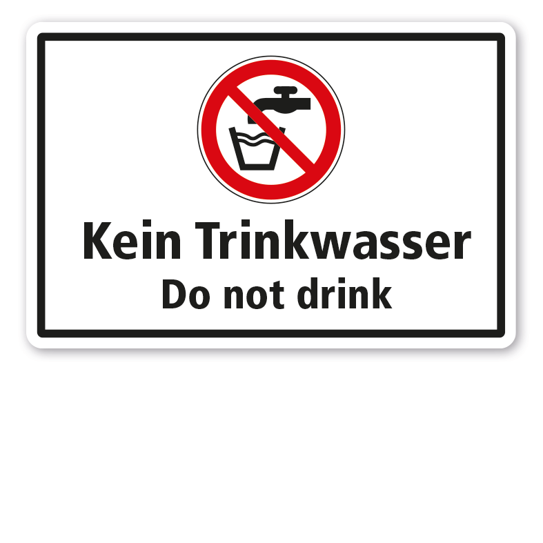 Verbotsschild Kein Trinkwasser - Do not drink als flexibles Kombinationsschild mit Sicherheitszeichen und Textbereich. Kombinationsschilder beinhalten mehrere genormte oder praxisbewährte Sicherheitszeichen mit passenden Textinhalten, um Missverständnisse zu vermeiden bzw. bestimmte Sicherheitsanforderungen näher zu erläutern, die nur von einzelnen Sicherheitszeichen eventuell nicht eindeutig vermittelt werden. In diversen Größen erhältlich, auch mit Ihrem Wunschtext.
