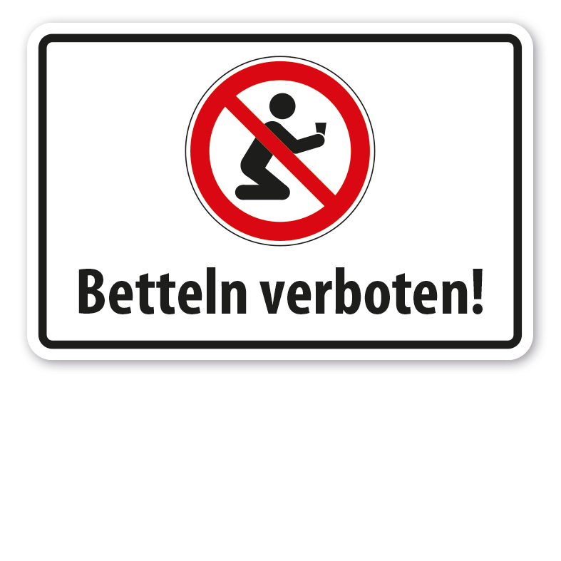 Verbotsschild Betteln verboten als flexibles Kombinationsschild mit Sicherheitszeichen und Textbereich. Kombinationsschilder beinhalten mehrere genormte oder praxisbewährte Sicherheitszeichen mit passenden Textinhalten, um Missverständnisse zu vermeiden bzw. bestimmte Sicherheitsanforderungen näher zu erläutern, die nur von einzelnen Sicherheitszeichen eventuell nicht eindeutig vermittelt werden. In diversen Größen erhältlich, auch mit Ihrem Wunschtext.