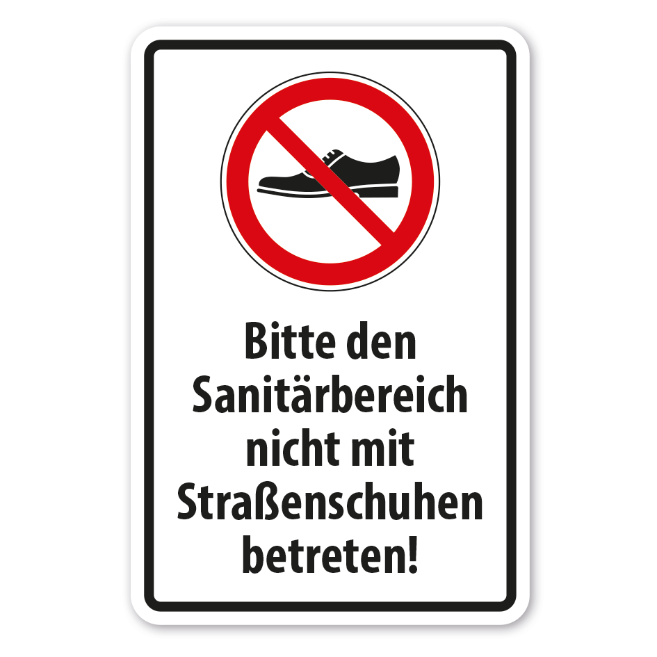 Verbotsschild Bitte den Sanitärbereich nicht mit Straßenschuhen betreten als flexibles Kombinationsschild mit Sicherheitszeichen und Textbereich. Kombinationsschilder beinhalten mehrere genormte oder praxisbewährte Sicherheitszeichen mit passenden Textinhalten, um Missverständnisse zu vermeiden bzw. bestimmte Sicherheitsanforderungen näher zu erläutern, die nur von einzelnen Sicherheitszeichen eventuell nicht eindeutig vermittelt werden. In diversen Größen erhältlich, auch mit Ihrem Wunschtext.