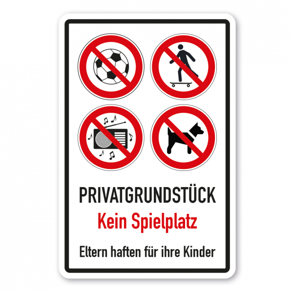Verbotsschild Privatgrundstück - kein Spielplatz - Eltern haften für ihre Kinder - Kombi nach älterer Norm oder praxisbewährt als Kombinationsschild mit Zusatztext. Kombinationsschilder beinhalten genormte oder praxisbewährte Verbotszeichen mit Textinhalten, um Missverständnisse zu vermeiden bzw. bestimmte Verbotsanweisungen näher zu erläutern, die nur von Verbotsszeichen eventuell nicht eindeutig vermittelt werden. Mit einem Kombinationsschild, dem richtigen Verbotszeichen und einem aussagekräftigen Text beugen Sie jeglicher Fehlinterpretation des Verbotsschildes eindeutig vor.