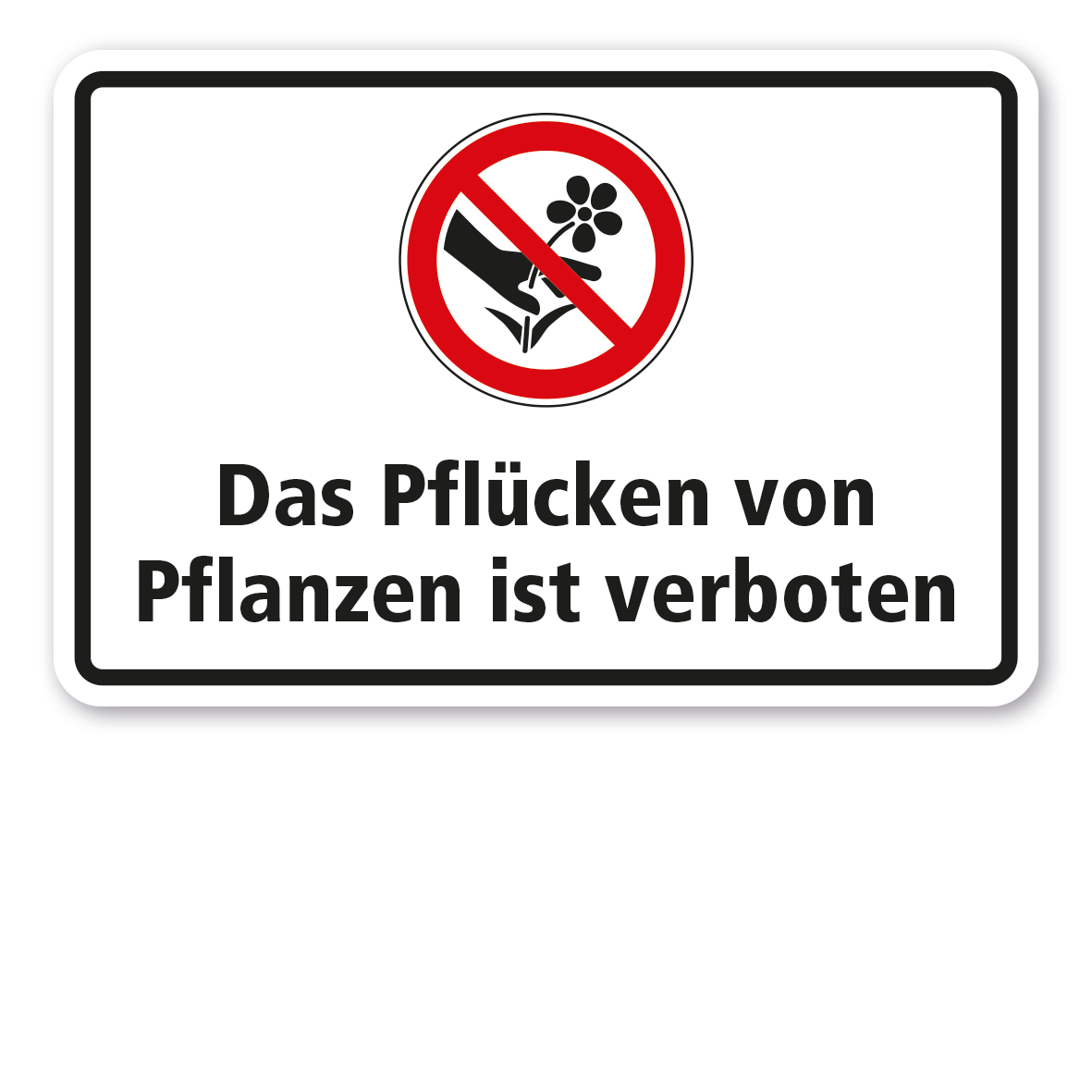 Verbotsschild Das Pflücken von Pflanzen ist verboten - Kombi nach älterer Norm oder praxisbewährt als Kombinationsschild mit Zusatztext. Kombinationsschilder beinhalten genormte oder praxisbewährte Verbotszeichen mit Textinhalten, um Missverständnisse zu vermeiden bzw. bestimmte Verbotsanweisungen näher zu erläutern, die nur von Verbotsszeichen eventuell nicht eindeutig vermittelt werden. Mit einem Kombinationsschild, dem richtigen Verbotszeichen und einem aussagekräftigen Text beugen Sie jeglicher Fehlinterpretation des Verbotsschildes eindeutig vor.