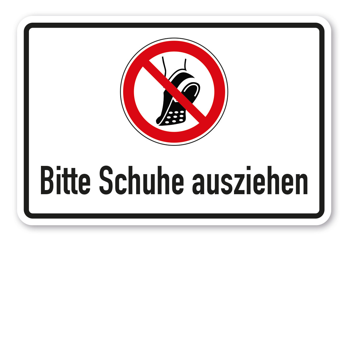 Verbotsschild Bitte Schuhe ausziehen - Kombi nach älterer Norm oder praxisbewährt als Kombinationsschild mit Zusatztext. Kombinationsschilder beinhalten genormte oder praxisbewährte Verbotszeichen mit Textinhalten, um Missverständnisse zu vermeiden bzw. bestimmte Verbotsanweisungen näher zu erläutern, die nur von Verbotsszeichen eventuell nicht eindeutig vermittelt werden. Mit einem Kombinationsschild, dem richtigen Verbotszeichen und einem aussagekräftigen Text beugen Sie jeglicher Fehlinterpretation des Verbotsschildes eindeutig vor.