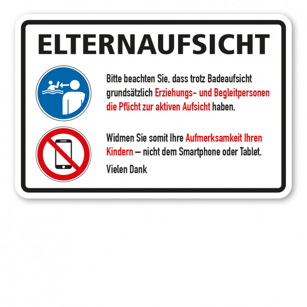 Hinweisschild für Schwimmbäder und Badebereiche Elternaufsicht - Bitte beachten Sie, dass trotz Badeaufsicht Erziehungs- und Begleitpersonen die Pflicht zur aktiven Aufsicht haben. Widmen Sie somit Ihre Aufmerksamkeit Ihren Kindern, nicht dem Smartphone oder Tablet. als Kombinationsschild mit Zusatztext. Kombinationsschilder beinhalten genormte oder praxisbewährte Gebotszeichen mit Textinhalten, um Missverständnisse zu vermeiden bzw. bestimmte Schutzanweisungen näher zu erläutern, die nur von Gebotszeichen eventuell nicht eindeutig vermittelt werden. Mit einem Kombinationsschild, dem richtigen Gebotszeichen und einem aussagekräftigen Text beugen Sie jeglicher Fehlinterpretation der Schutzanweisung eindeutig vor.