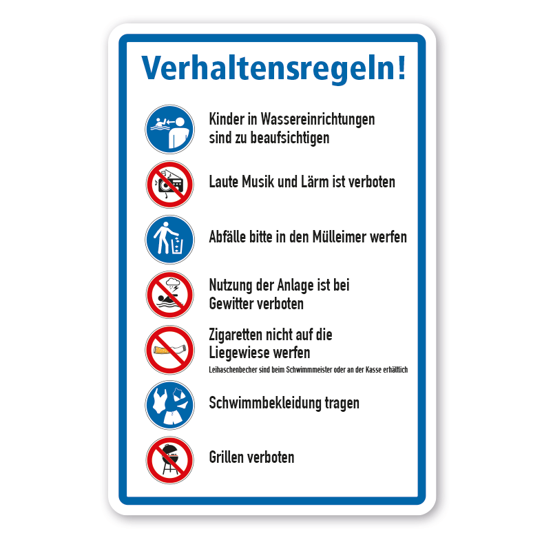 Verhaltensregeln im Schwimmbad - mit Sicherheitszeichen als Kombinationsschild mit Zusatztexten. Kombinationsschilder sind Schilder mit genormten oder praxisbewährten Zeichen sowie ergänzenden Textinhalten, die unterhalb der Sicherheitszeichen angeordnet sind. Aufgrund dieser Kombination und auch der Möglichkeit, bestehende Inhalte zu verändern, erfüllen Kombinationsschilder alle Anforderungen, um eine flexible, individuelle Beschilderung sicherzustellen. Wir führen zahlreiche Kombinationsschilder für die betriebliche oder kommunale Beschilderung in vielen Schildervarianten in standardisierten oder individuellen, an Ihre Bedürfnisse angepassten Ausführungen.