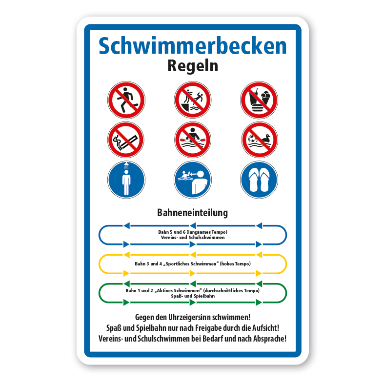 Schwimmerbecken-Regeln - Bahneinteilung - mit Sicherheitszeichen als Kombinationsschild mit Zusatztexten. Kombinationsschilder sind Schilder mit genormten oder praxisbewährten Zeichen sowie ergänzenden Textinhalten, die unterhalb der Sicherheitszeichen angeordnet sind. Aufgrund dieser Kombination und auch der Möglichkeit, bestehende Inhalte zu verändern, erfüllen Kombinationsschilder alle Anforderungen, um eine flexible, individuelle Beschilderung sicherzustellen. Wir führen zahlreiche Kombinationsschilder für die betriebliche oder kommunale Beschilderung in vielen Schildervarianten in standardisierten oder individuellen, an Ihre Bedürfnisse angepassten Ausführungen.