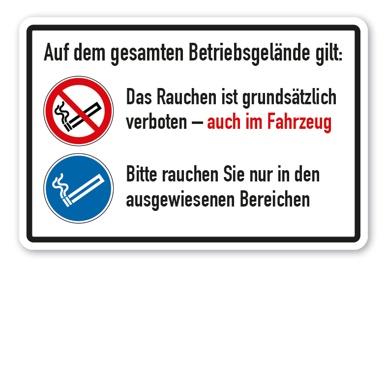 Betriebsschild Auf dem gesamten Betriebsgelände gilt - Rauchverbot - Auch im Fahrzeug - Rauchen erlaubt in ausgewiesenen Bereichen mit genormten Sicherheitszeichen als Kombinationsschild mit Zusatztext. Kombinationsschilder beinhalten genormte oder praxisbewährte Sicherheitsschild mit Textinhalten, um Missverständnisse zu vermeiden bzw. bestimmte Verbotsanweisungen und Hinweise näher zu erläutern, die nur von Sicherheitszeichen eventuell nicht eindeutig vermittelt werden. Mit einem Kombinationsschild, den richtigen Sicherheitszeichen und einem aussagekräftigen Text beugen Sie jeglicher Fehlinterpretation des Sicherheitsschildes eindeutig vor.