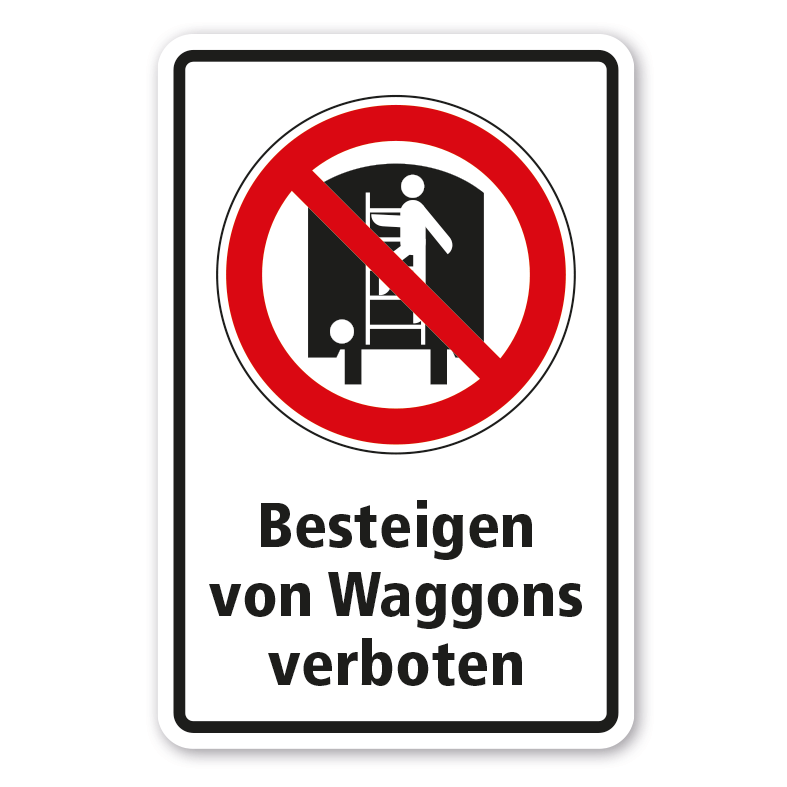 Verbotsschild Besteigen von Waggons verboten als Kombinationsschild mit Verbotszeichen und Zusatztext. Kombinationsschilder beinhalten genormte oder praxisbewährte Verbotszeichen mit Textinhalten, um Missverständnisse zu vermeiden bzw. bestimmte Verbotsanweisungen näher zu erläutern, die nur von Verbotsszeichen eventuell nicht eindeutig vermittelt werden. Mit einem Kombinationsschild, dem richtigen Verbotszeichen und einem aussagekräftigen Text beugen Sie jeglicher Fehlinterpretation des Verbotsschildes eindeutig vor.