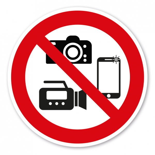 Verbotszeichen Fotografieren und Filmen verboten. Verbotszeichen weisen in der Regel darauf hin, dass ein bestimmtes Verhalten verboten ist, um eine Gefährdung von Personen oder Maschinen abzuwenden oder dass bestimmte Handlungen aus anderen Gründen unerwünscht sind.