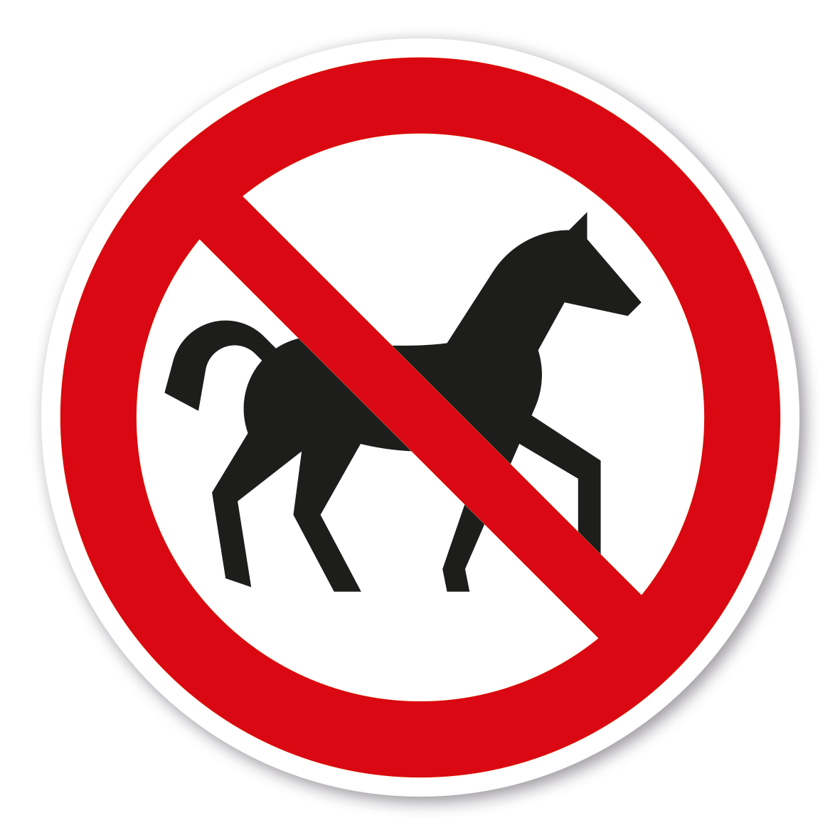 Verbotszeichen Für Pferde verboten – ältere Norm oder praxisbewährtes Zeichen. Verbotszeichen weisen in der Regel darauf hin, dass ein bestimmtes Verhalten verboten ist, um eine Gefährdung von Personen oder Maschinen abzuwenden oder dass bestimmte Handlungen aus anderen Gründen unerwünscht sind.
