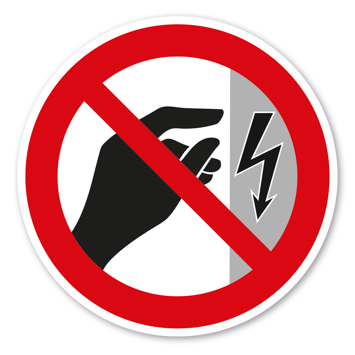 Verbotszeichen Nicht berühren, Gehäuse ist unter Spannung – ältere Norm oder praxisbewährtes Zeichen. Verbotszeichen weisen in der Regel darauf hin, dass ein bestimmtes Verhalten verboten ist, um eine Gefährdung von Personen oder Maschinen abzuwenden oder dass bestimmte Handlungen aus anderen Gründen unerwünscht sind.