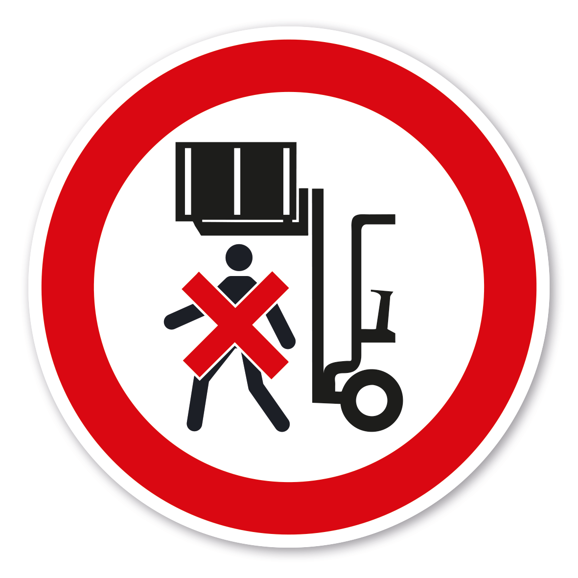 Verbotszeichen Nicht unter angehobene Lasten treten – ältere Norm oder praxisbewährtes Zeichen. Verbotszeichen weisen in der Regel darauf hin, dass ein bestimmtes Verhalten verboten ist, um eine Gefährdung von Personen oder Maschinen abzuwenden oder dass bestimmte Handlungen aus anderen Gründen unerwünscht sind.