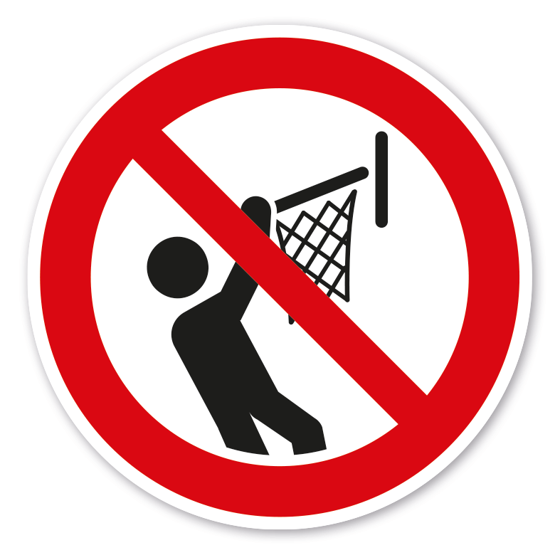 Verbotszeichen Nicht an den Basketballkorb hängen - No dunking. Verbotszeichen weisen in der Regel darauf hin, dass ein bestimmtes Verhalten verboten ist, um eine Gefährdung von Personen oder Maschinen abzuwenden oder dass bestimmte Handlungen aus anderen Gründen unerwünscht sind.