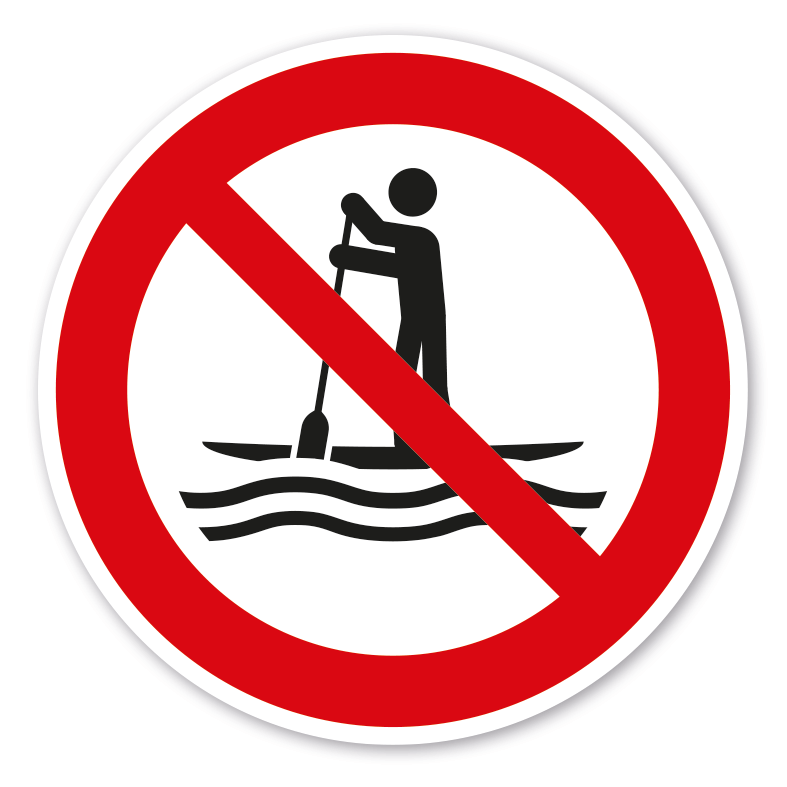 Verbotszeichen Stand-up-Paddeln (SUP) verboten - praxisbewährtes Zeichen. Verbotszeichen weisen in der Regel darauf hin, dass ein bestimmtes Verhalten verboten ist, um eine Gefährdung von Personen oder Maschinen abzuwenden oder dass bestimmte Handlungen aus anderen Gründen unerwünscht sind.