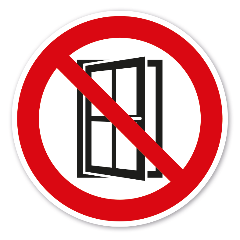 Verbotszeichen Fenster öffnen verboten. Verbotszeichen weisen in der Regel darauf hin, dass ein bestimmtes Verhalten verboten ist, um eine Gefährdung von Personen oder Maschinen abzuwenden oder dass bestimmte Handlungen aus anderen Gründen unerwünscht sind.