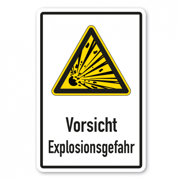 Warnschild Warnung vor explosionsgefährlichen Stoffen nach ISO 7010 und ASR A 1.3 (2013) als Kombinationsschild mit Zusatztext. Kombinationsschilder beinhalten genormte oder praxisbewährte Warnzeichen mit Textinhalten, um Missverständnisse zu vermeiden bzw. bestimmte Warnhinweise näher zu erläutern, die nur von Warnzeichen eventuell nicht eindeutig vermittelt werden. Mit einem Kombinationsschild, dem richtigen Warnzeichen und einem aussagekräftigen Text beugen Sie jeglicher Fehlinterpretation des Warnschildes eindeutig vor.