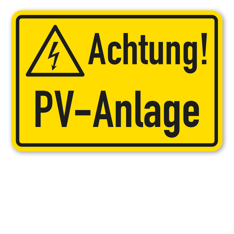 Schild Achtung Photovoltaik - PV - Anlage. Dieses Schild ist in diversen Größen erhältlich – als Standardschild für oder in individueller Ausführung für eine bedarfsbezogene Beschilderung.