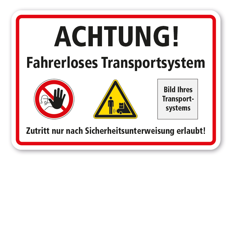 Warnschild Achtung - Fahrerloses Transportsystem. Zutritt nur nach Sicherheitsunterweisung erlaubt - mit Ihrem Systembild. Erhältlich in diversen Größen. Zur Kennzeichnung von Lagern und Betriebsstätten mit fahrerlosen Transportfahrzeugen.