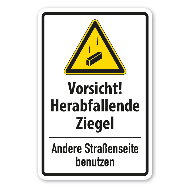 Warnschild Vorsicht - Herabfallende Ziegel - Andere Straßenseite benutzen – in vielen Größen erhältlich.