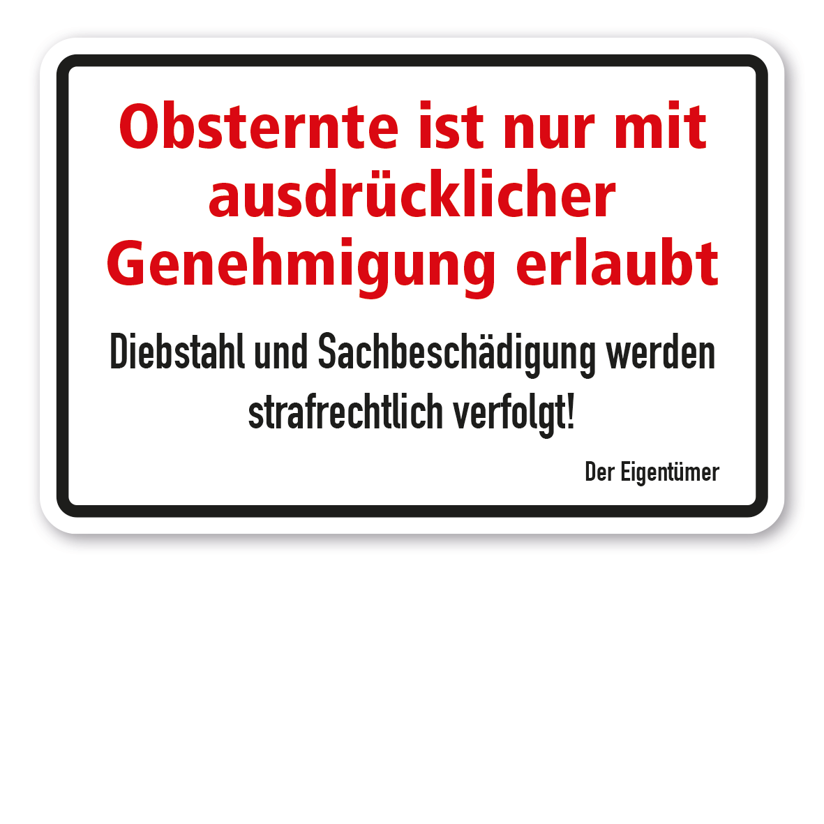 Merkmale des Ernteschildes Obsternte ist nur mit ausdrücklicher Genehmigung erlaubt. Diebstahl und Sachbeschädigung werden strafrechtlich verfolgt – Textschild – LW-E-20: