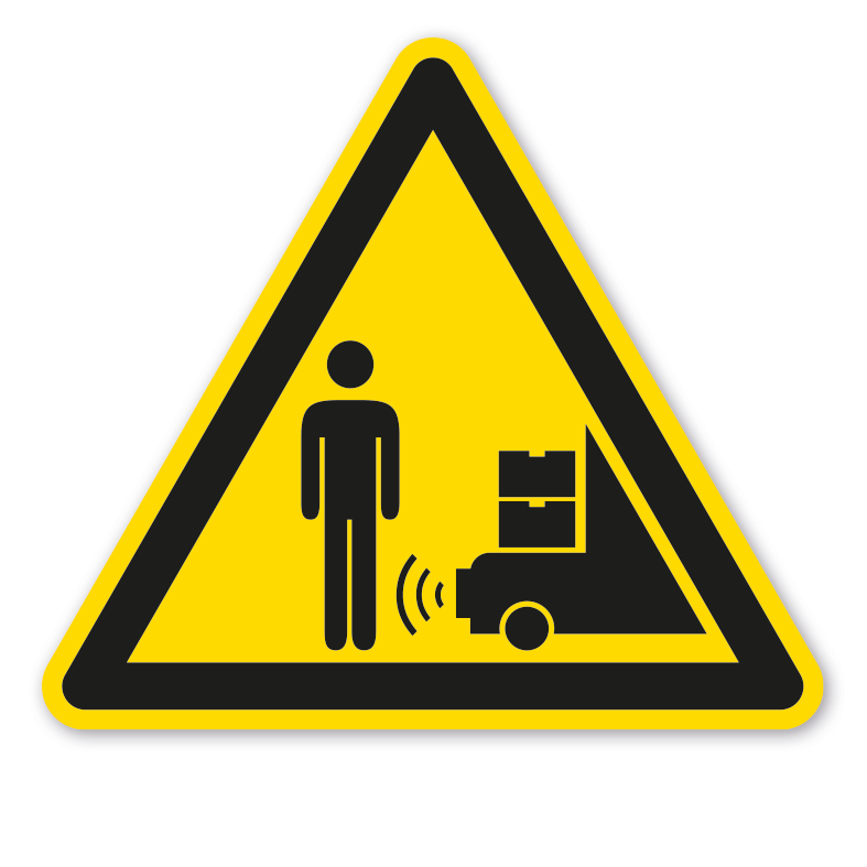 Warnzeichen Warnung vor fahrerlosem Transportsystem – praxisbewährtes Zeichen. Warnzeichen sind Sicherheitszeichen, die vor einer Gefahrstelle oder Gefahrensituation warnen. Sie weisen darauf hin, dass eine erhöhte Aufmerksamkeit erforderlich ist, um eine Gefährdung von Personen und Tieren abzuwenden.