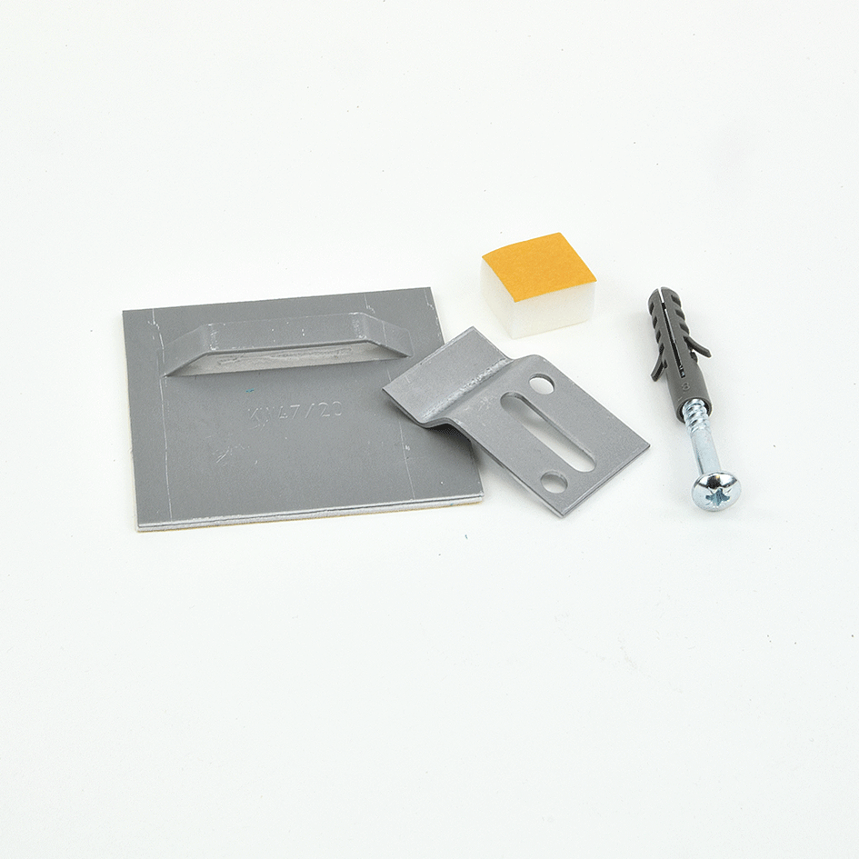 Produktinformationen "Selbstklebende Schilderbefestigung zur Wandmontage - Z-Haken, Schilderhalter, Wandpuffer, Schraube u. Dübel als 2er Set"